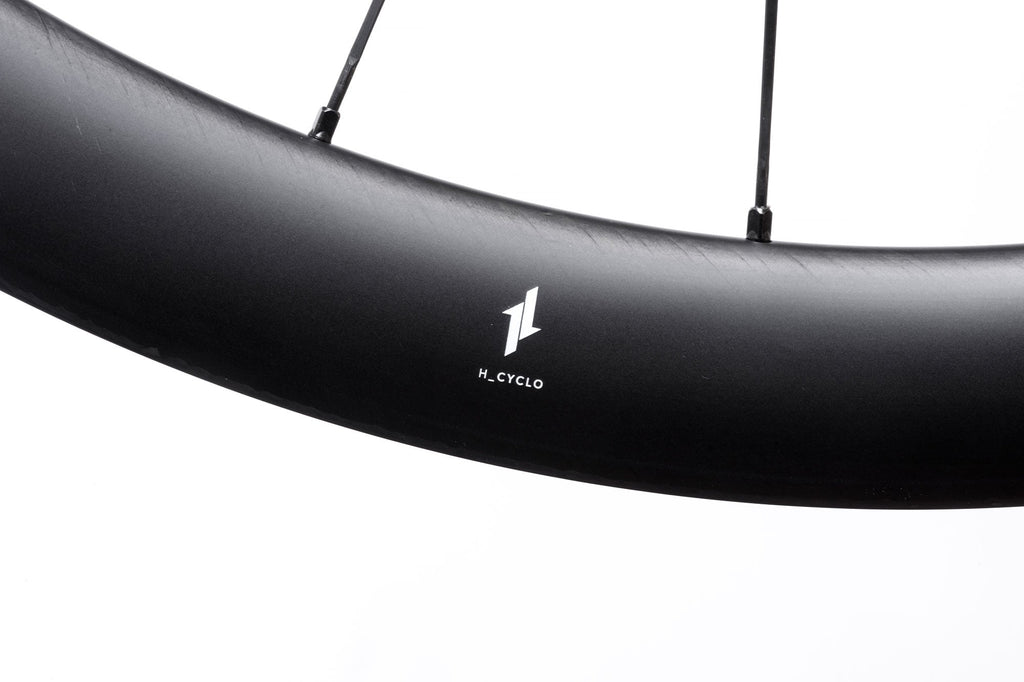 RimsDisc-specific hookless/straight-sidewall design. H_Cyclo Recyclable resin technology. 30mm external and 25mm internal width. H_LOCK bead-seat up-kicks, for easy and secure tubeless installation. UD carbon fiber finish with matt white contrasting graphics.