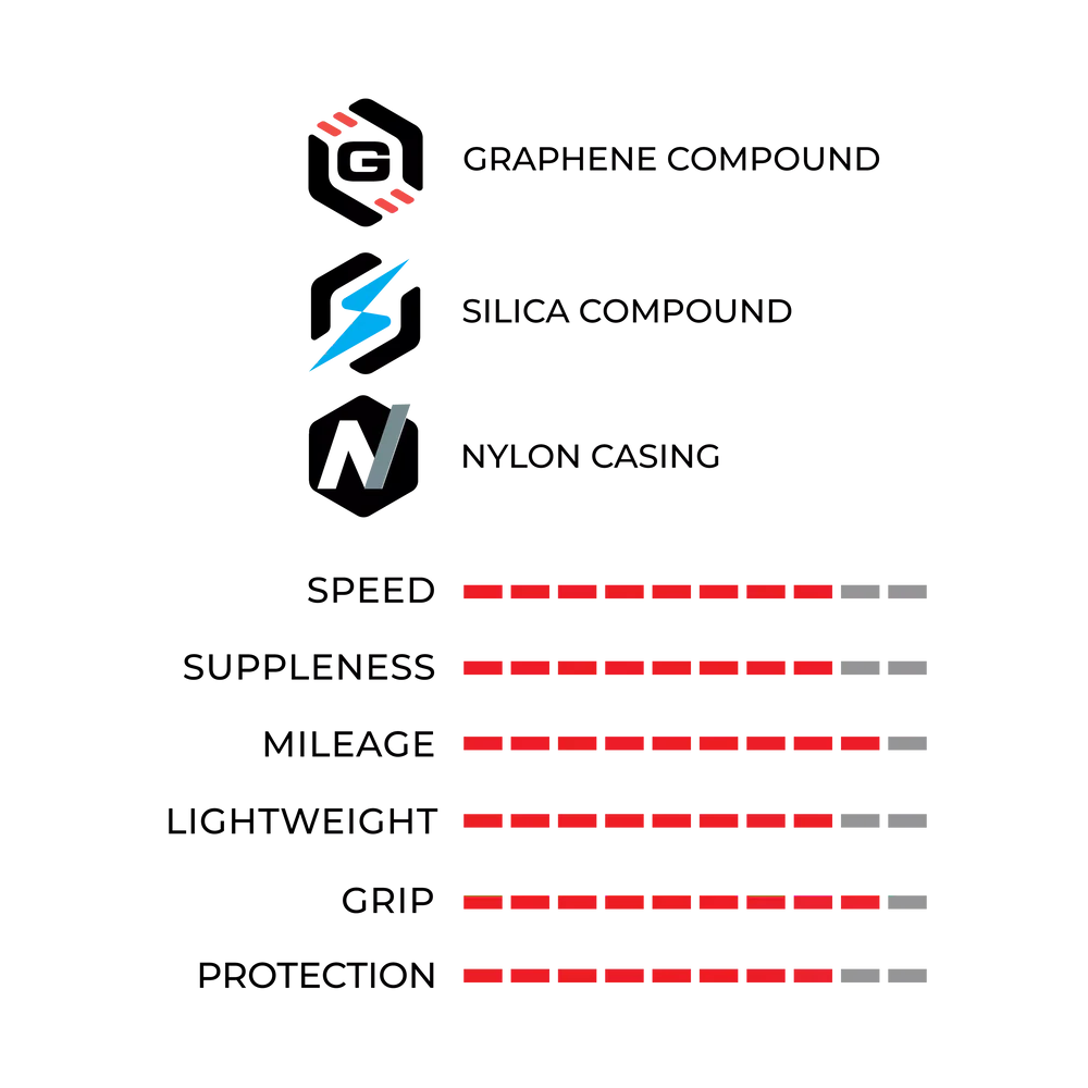 Starting with our supple yet durable 100 TPI nylon casing, and adding a proprietary mix of 2 different Graphene compounds plus Silica. The new Corsa N.EXT achieves racing inspired speed and feel, with the everyday durability of nylon construction. Nylon casing provides durability, for daily racers who want to raise the bar of their performance relying on a long-lasting tire.