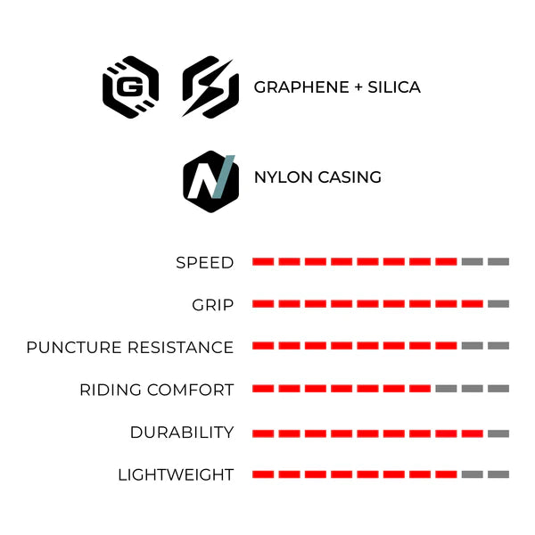 - Graphene and Silcia - compound is engineered for long mileage, puncture resistance, high grip and speed for everyday use.