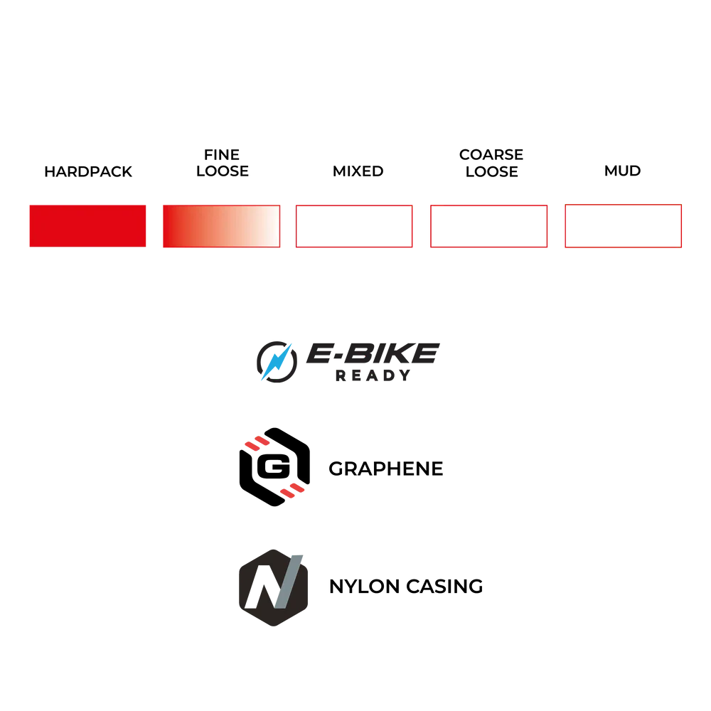 The Terreno T10 Hardpack Gravel Endurance tire is the most road-efficient model in the Vittoria Gravel Endurance range, engineered for speed and control on compact surfaces. The heart of the T10 is Vittoria’s Endurance Formulation powered by Graphene, delivering proven durability, weather resistance, and consistent performance across seasons and surfaces. A Corsa-inspired and fast rolling slick center strip is paired with revolutionary fish scale shoulders, adapted from the Terreno T30, for added cornering grip and navigating wet or variable terrain. Built with our Endurance Casing, the T10 offers high adaptability and structural strength for long-distance riding, reinforced with a nylon sidewall protection layer and an anti-puncture belt to ensure maximum reliability and peace of mind.